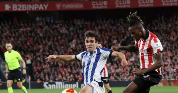 मैड्रिड । स्पेन के प्रतिष्ठित फुटबॉल टूर्नामेंट कोपा डेल रे के सेमीफाइनल के पहले चरण में रियल सोसिएदाद ने एथलेटिक बिलबाओ को 1-0 से हराकर अहम बढ़त हासिल कर ली। बुधवार को सैन मामेस स्टेडियम में खेले गए इस मुकाबले में बेनात तुरिएंतस ने 62वें मिनट में नजदीकी दूरी से गोल दागकर टीम को जीत दिलाई।