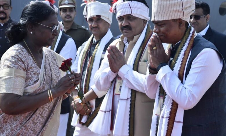 देश की राष्ट्रपति द्रौपदी मुर्मू का आज बस्तर संभाग के मुख्यालय जगदलपुर में गरिमामय आगमन हुआ। वे यहां के ऐतिहासिक लालबाग मैदान में आयोजित होने वाले तीन दिवसीय संभाग स्तरीय बस्तर पण्डुम का शुभारंभ करने पहुंची हैं। मां दंतेश्वरी एयरपोर्ट पर राष्ट्रपति मुर्मू का राज्यपाल रमेन डेका और मुख्यमंत्री विष्णु देव साय ने आत्मीय स्वागत किया।