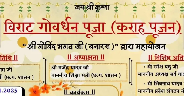 बलरामपुर। विजयनगर में इस वर्ष भी परंपरा और आस्था का प्रतीक विराट गोवर्धन पूजा (कराह पूजन) का आयोजन बड़े उत्साह और श्रद्धा के साथ किया जा रहा है। आयोजन का संचालन बनारस से आए गोविंद भगत के सान्निध्य में होगा। इस अवसर पर छत्तीसगढ़ शासन के मंत्री गजेन्द्र यादव और वरिष्ठ नेता राम विचार नेताम विशेष अतिथि के रूप में शामिल रहेंगे।