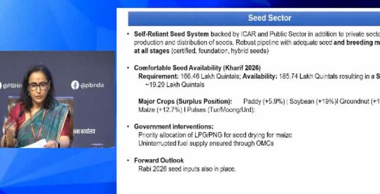 नई दिल्ली।  पश्चिम एशिया संघर्ष के बीच सरकार ने आज आश्वासन दिया कि देश में सभी प्रकार की फसलों के बीज पर्याप्त मात्रा में उपलब्ध हैं। पश्चिम एशिया के हाल के घटनाक्रमों पर नई दिल्ली में आयोजित अंतरमंत्रालयी बैठक में कृषि और किसान कल्याण विभाग की अपर सचिव डॉ. मनिंदर कौर द्विवेदी ने बताया कि देश भर में खरीफ फसलों के 185 लाख क्विंटल से अधिक बीज उपलब्ध हैं। अपर सचिव ने कहा कि देश में कृषि रसायनों की भी पर्याप्त उपलब्धता है।