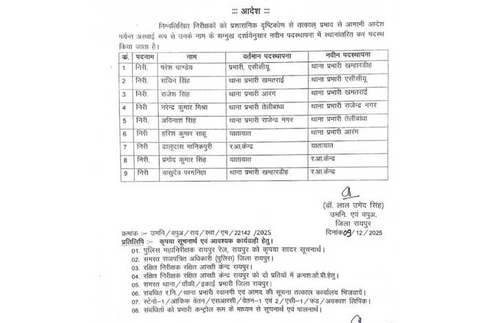 आपको बताते चलें प्रशासनिक दृष्टिकोण से अस्थाई रूप से उनके नाम के अनुसार नवीन पदस्थापना में स्थानांतरित कर पदस्थ किया गया है। यह आदेश तत्काल प्रभाव से लागू हुआ है और आगामी आदेश पर्यन्त वैध रहेगा। सूची में शामिल निरीक्षक और उनकी नई जिम्मेदारियां इस प्रकार हैं: निरीक्षक परेश पाण्डेय, जो वर्तमान में एसीसीयू प्रभारी और थाना प्रभारी खम्हारडीह थे, को उसी जिम्मेदारी के साथ नई व्यवस्थाओं के तहत पदस्थ किया गया है। निरीक्षक सचिन सिंह को थाना प्रभारी खमतराई से एसीसीयू में स्थानांतरित किया गया है। वहीं राजेश सिंह को थाना प्रभारी आरंग से खमतराई पदस्थ किया गया है। थाना प्रभारी तेलीबांधा नरेन्द्र कुमार मिश्रा को राजेन्द्र नगर में पदस्थ किया गया है, जबकि अविनाश सिंह को राजेन्द्र नगर से तेलीबांधा स्थानांतरित किया गया है। यातायात में कार्यरत निरीक्षक हरिश कुमार साहू को थाना प्रभारी आरंग, ढालूदास मानिकपुरी को र.आ. केन्द्र से यातायात और प्रमोद कुमार सिंह को यातायात से र.आ. केन्द्र में स्थानांतरित किया गया है। वासुदेव परगनिहा को थाना प्रभारी खम्हारडीह से र.आ. केन्द्र में पदस्थ किया गया है। जारी आदेश के तहत सभी निरीक्षकों को अपने नए पदस्थापन स्थलों पर तत्काल कार्यभार ग्रहण करने के निर्देश दिए गए हैं। संबंधित रक्षित निरीक्षक और थाना प्रभारी को रवानगी और आगमन की सूचना कार्यालय में तत्काल भेजने का निर्देश भी दिया गया है।